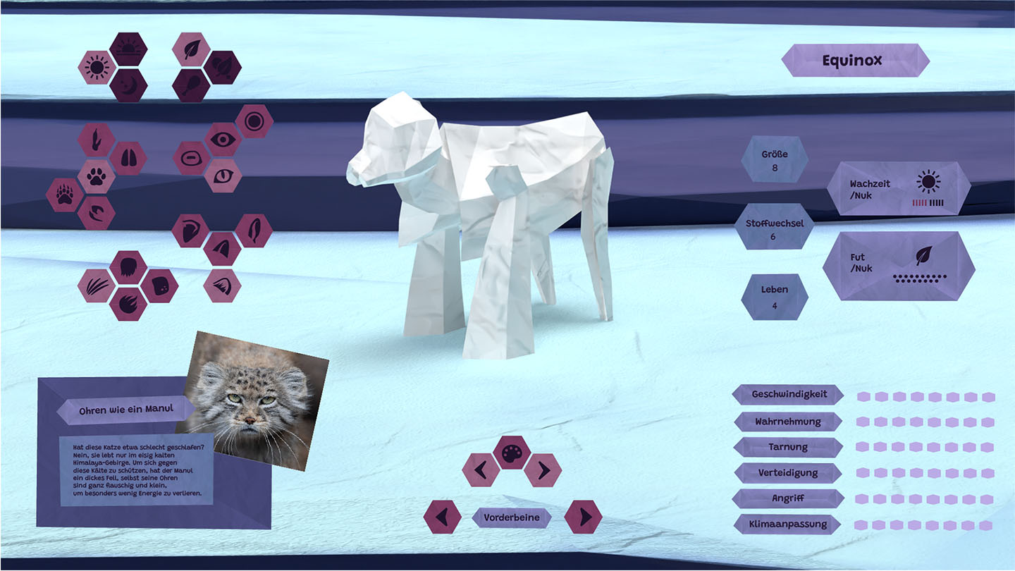 Warum haben Giraffen lange Hälse? Warum haben Igel Stacheln? Spielerisch kann man dies in meinem Spielkonzept “CreateTure” herausfinden. Der Nutzer erstellt sich eine Kreatur und lässt diese auf die Spielfläche los und schaut ihr beim Entwickeln zu. Ist sie gut angepasst, zum Beispiel mit langem Fell in der Kälte, hat sie gute Chancen zu überleben. Aber jeder Vorteil kommt auch mit einem Nachteil! Der Energiehaushalt sollte nicht überschritten werden! Ziel des Spiels ist es ein möglichst komplexes Ökosystem aus bunten Kreaturen zu erstellen.